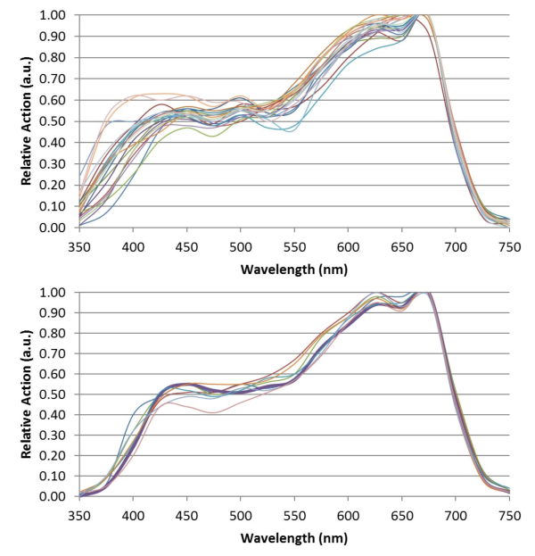 To quote from the abstract of the paper[1]: "The action spectrum, absorptance and spectral quantum yield of CO2 uptake were measured, for leaves of 22 species of crop plant, over the wavelength range 350 to 750 nm. The following factors were varied: species, variety, age of leaf, growth conditions (field or growth chamber), test conditions such as temperature, CO2 concentration, flux of monochromatic radiation, flux of supplementary white radiation, orientation of leaf (adaxial or abaxial surface exposed). For all species and conditions the quantum yield curve had 2 broad maxima, centered at 620 and 440 nm, with a shoulder at 670 nm. The average height of the blue peak was 70% of that of the red peak."[3] |