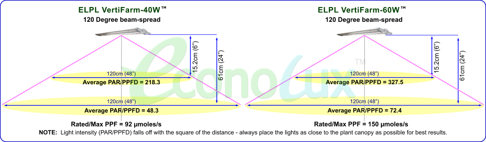 ► PAR/PPFD = VertiFarm-40TM 92 µmoles/s - VertiFarm-60TM 150 µmoles/s -